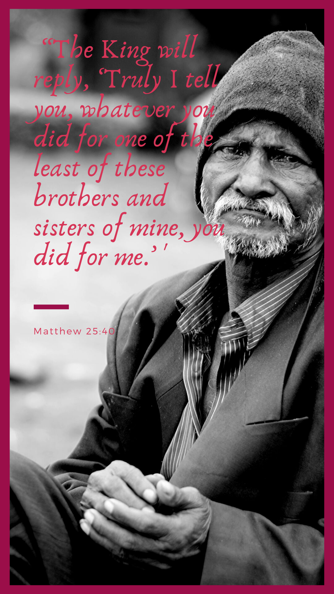 Previous Image Next Image e2809cthe-king-will-reply-e28098truly-i-tell-you-whatever-you-did-for-one-of-the-least-of-these-brothers-and-sisters-of-mine-you-did-for-me.e28099-matthew-25_40